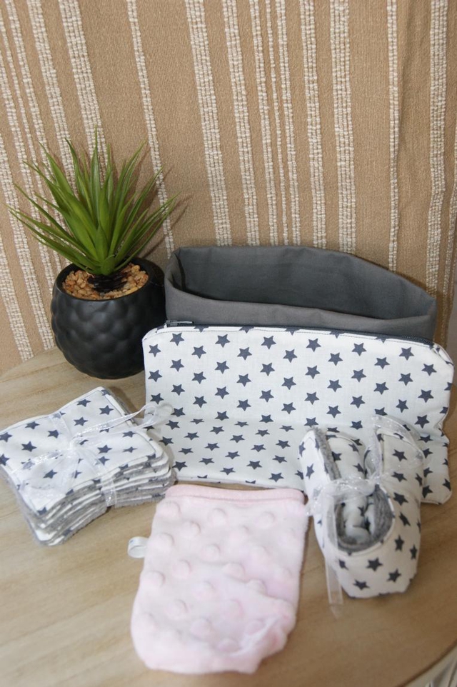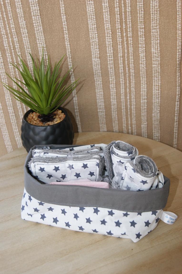 Panier 20x10cm comprenant 1lot de 7 lingettes de 8x8cm, une trousse 21x14cm, une serviette 22x22cm et un petit gant 13x9cm